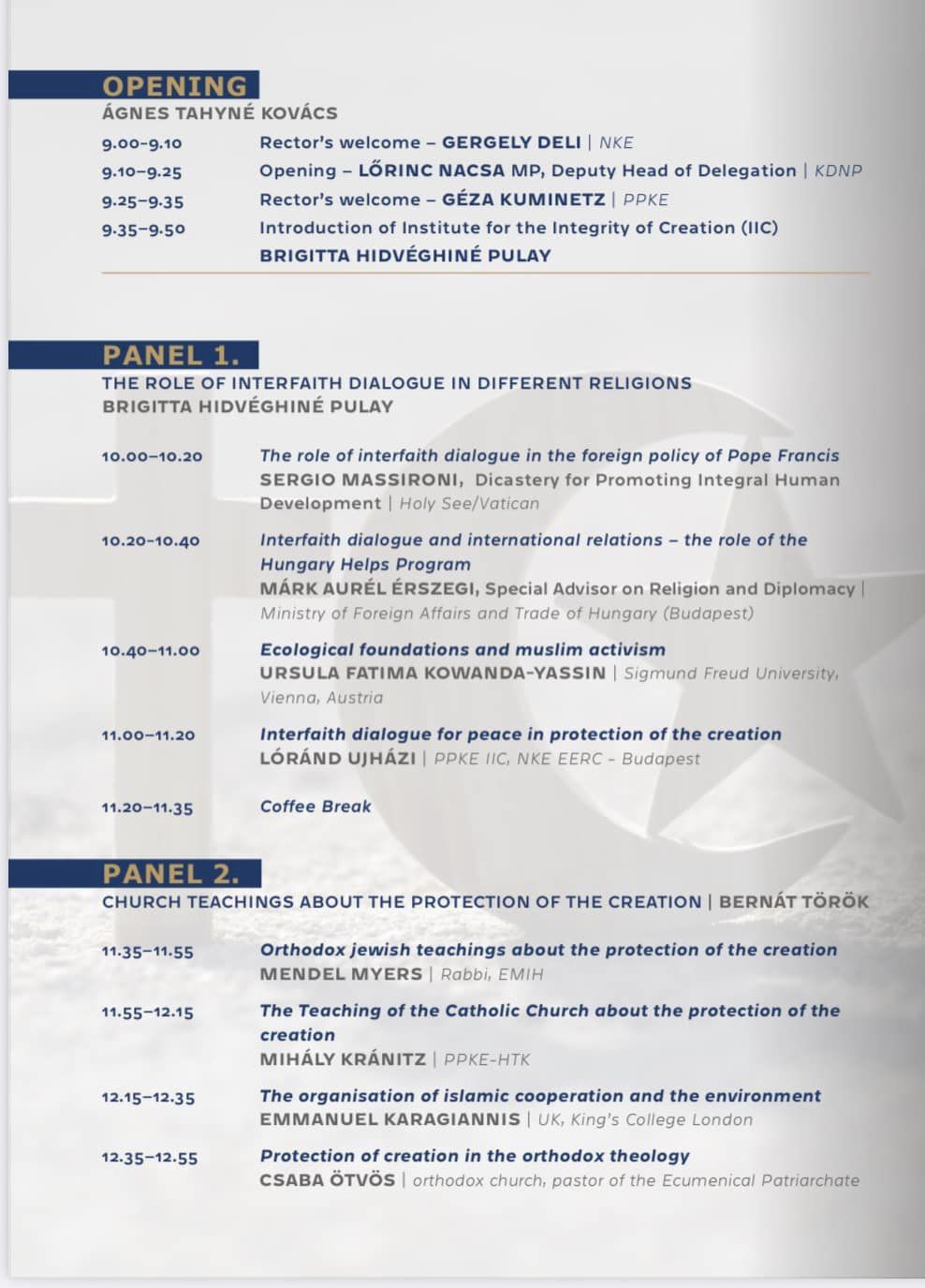 Ujházi Lóránd, a kutatóintézet vezetője bemutatta az immár 15 éves múltra visszatekintő vallás- és biztonságfókuszú intézetét, az ott folyó kutatásokat. Rámutatott, hogy a teremtésvédelem egyszerre szociális, környezeti és gazdasági kérdés. Gájer László, a PPKE Hittudományi Karának tanszékvezető tanára hozzátette, magát a szót először egy 2008-as hazai püspöki konferencia említi, a témában megszülető első pápai körlevél pedig 2015-ös. A teremtésvédelem lényege, hogy a bennünket körülvevő környezetről a bibliai megközelítés alapján mint teremtésről beszélünk, amelynek az ember kiemelt része.