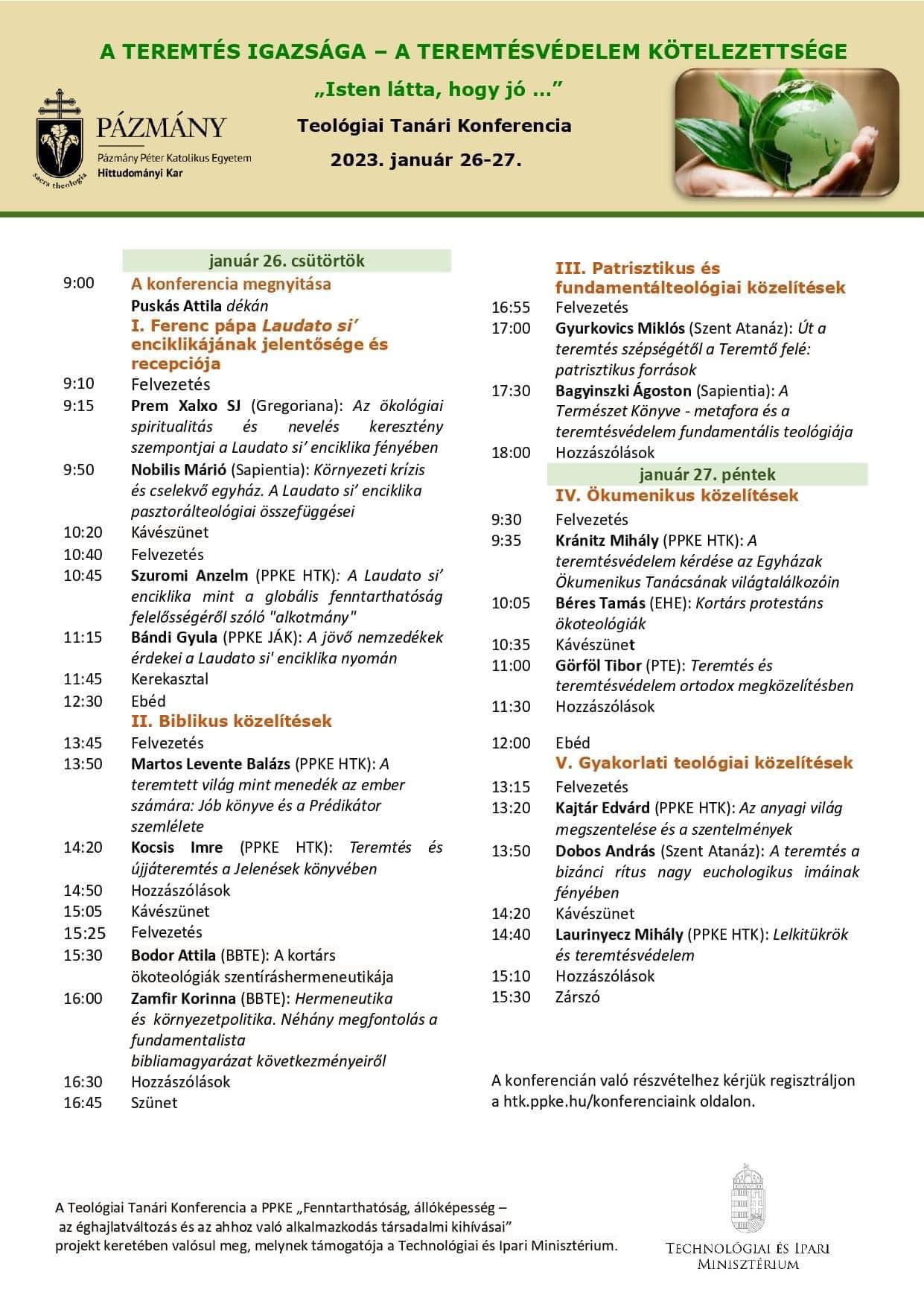 A Katolikus Egyház más keresztény egyházakkal együtt évtizedek óta intenzíven foglalkozik a teremtésvédelem kérdésével és elkötelezett bolygónk mint közös otthonunk gondozásában, csakúgy mint az ökológiai felelősségre nevelésben. A Konferencia egyik célja, hogy aktualizálja Ferenc pápa Laudato si' enciklikájának, mint a teremtésvédelem magna chartajának üzenetét. Ennek keretében kerül sor Prem Xalxo atya, a Gregoriana egyetem professzorának előadására a keresztény ökológiai spiritualitásról és a római pápai egyetemek közös ökoteológiai képzéséről. A másik cél annak keresése, hogy a teológia a bibliai tanítás, a szenthagyomány és a liturgia aktualizáló értelmezése révén, ökumenikus igénnyel hogyan járulhat hozzá a teremtés igazságának elmélyítéséhez, a teremtésvédelem ebből fakadó felelősségének tudatosításához és motivációjának erősítéséhez. Hidvéghiné Dr. Pulay Brigitta, a Teremtésvédelmi Kutatóintézet munkatársa mutatta be az intézet tevékenységét, majd Nobilis Márió a Laudato si' enciklika pasztorálteológiai összefüggéseiről beszélt. Elmondta: a Megváltó megtestesülése minden cselekvés lényegalkotó struktúrája. A pasztorálteológia ezt a cselekvést vizsgálja: hogyan tud ennek minél helyesebben megfelelni az Egyház. Ha az Egyház Krisztus cselekvő jelenlétének a folytatása, akkor foglalkoznia kell a világgal, Ferenc pápa szavaival: "Isten válaszává kell válnia." A Laudato si' enciklika szerint tudatformálásra, ökológiai megtérésre van szükség. Ebben az Egyház megtérési, evangelizációs és böjti tapasztalata mellett a plébániai modell és a remény tanítása is fontos szerepet játszik.